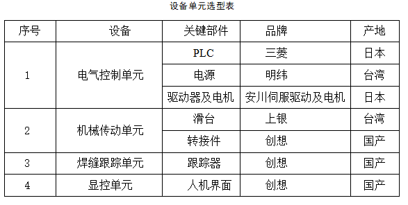 焊缝自动跟踪焊设备主要分为四个部分:电气控制单元、机械传动单元、焊缝跟踪单元,显控单元。实现设备由手动跟踪到自动跟踪的转换。减少操作步骤,提高生产效率,改善焊接质量。焊缝自动跟踪设备单元和选型情况如下表。