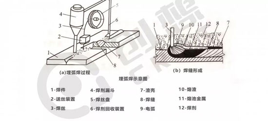 利用焊丝与焊件之间在焊剂层下燃烧的电弧产生热量,熔化焊丝、焊剂、和母材金属形成焊缝,连接被焊工件。