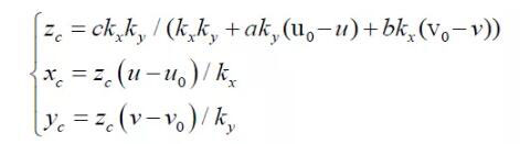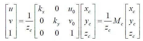 其中:(u,v)是特征点的图像坐标,(u0,v0) 光轴中心的图像坐标,(kx ky )是X 轴,Y 轴方向的放大系数,(xc yc zc) 是特征点在摄像机坐标系下坐标, Mc 是摄像机内参数矩阵。