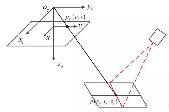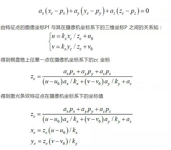 依据激光条纹特征点图像坐标就可以得到其在摄像机坐标系下的三维坐标: