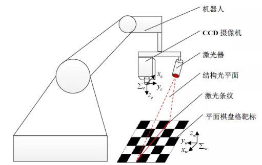一个六自由度机器人,一个CCD 工业摄像机,一个激光器和一个平面棋盘格靶标。