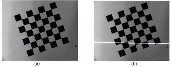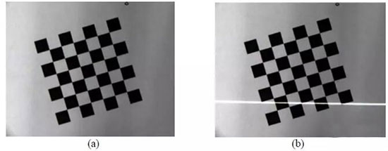 图像的获取是在摄机参数标定过程中同时完成。 首先将棋盘格放在工作台上, 在这个初始位置,利用摄像机采集一幅图,如图 (a) 所示 。保持摄像机和棋盘格的位置姿态不变,打开激光器让条纹投射到棋盘格上, 再采集一幅图像如图 (b) 所示: