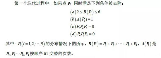 该方法通过迭代提取图像骨架,每个迭代过程分为两步,第一步去除东南边缘和西北角的点,第二步去除西北边缘和东南角的点。