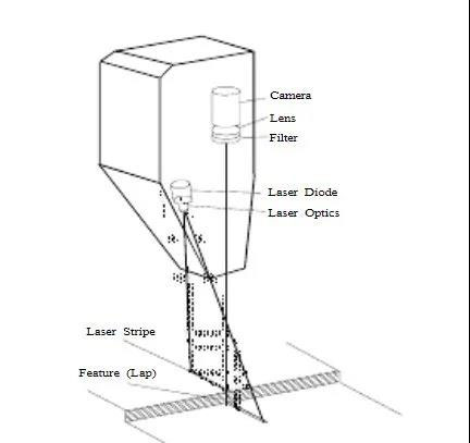 焊接跟踪传感器头部包括一个CCD摄像机和一个或两个半导体激光器。激光器作为结构光源,以预定的角度将激光条纹投影到传感器下部的工件表面。摄像机直接观察在传感器下部的条纹。摄像机前部是一个光学滤光片,允许激光通过但是滤去所有其他的光,例如焊接电弧。传感器因此能够非常接近焊接电弧。