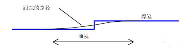 从摄像机观察到的图像被控制器处理,图像首先被获取并形成数字化的激光条纹图像。然后软件使用特定的设置来将条纹分成形成焊缝的许多条线。从这些线的位置,系统可以测量焊缝的位置,并将其转化成以mm计算的距离。这种转化是使用在传感头中存储的校准数据完成的。当系统正在进行跟踪时,焊接速度和前视距离被用来计算延迟时间。这就保证焊枪而不是传感器沿着焊缝行进。应该指出的是控制策略提供了平滑的前视距离以保证形成平滑的焊缝。因此如果传感器在路径上遇到了一个台阶的变化,他将会提供一个平滑的响应,如下图所示。